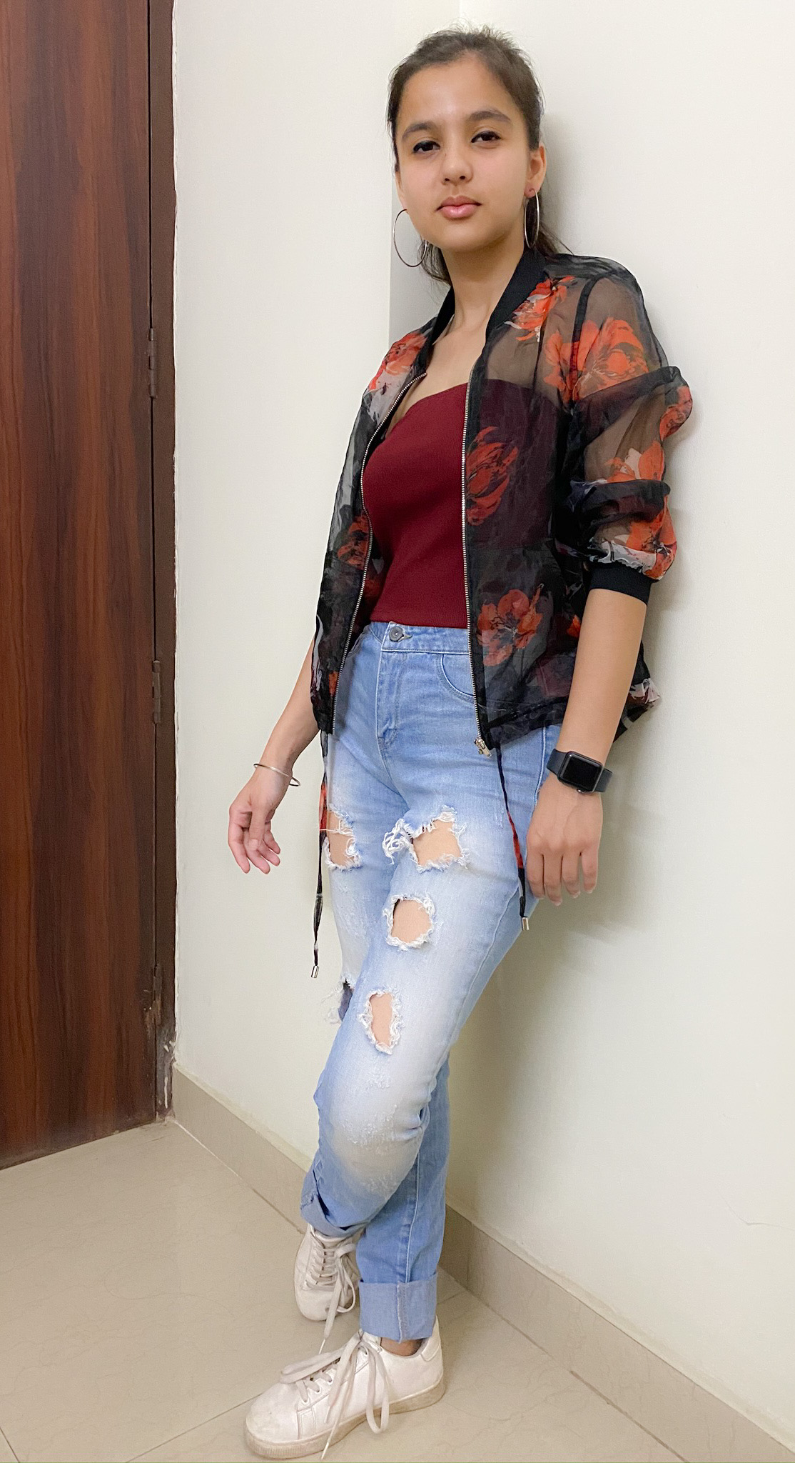 The first look is with a sheer jacket, paired the look with a black sheer jacket with white and red floral detailing on it. Added rugged blue denims to the look. Completed the look with white sneakers and silver hoops.